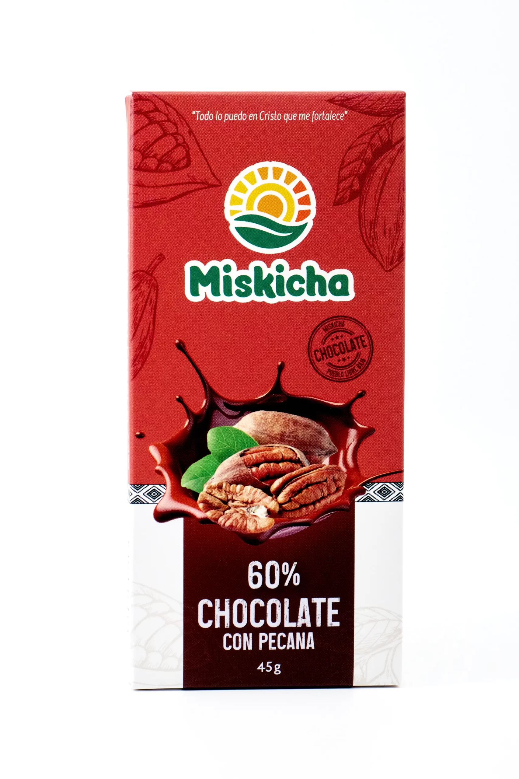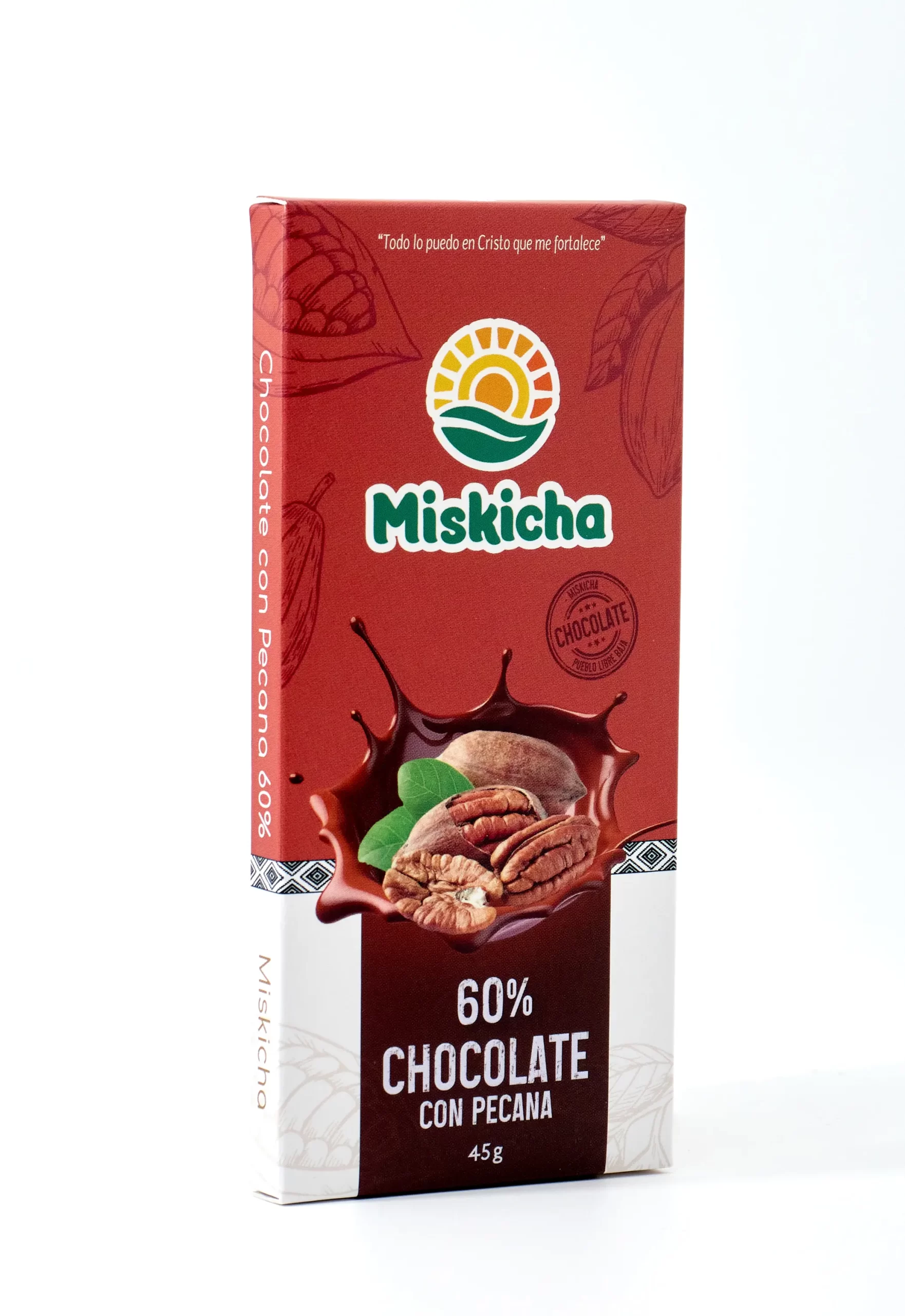 Ingredientes: Granos de cacao fermentados, manteca de cacao, leche en polvo, azúcar y pecanas